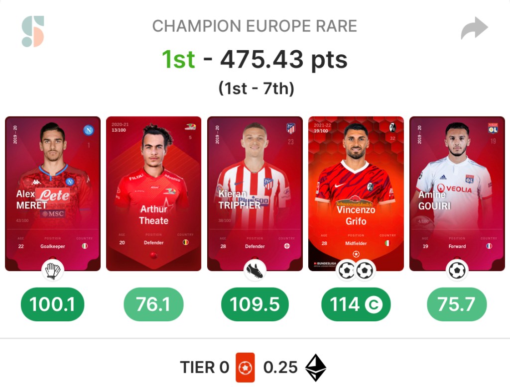 I’ve had moderate success on Sorare, most recently with a 1st place finish in Champion Europe!