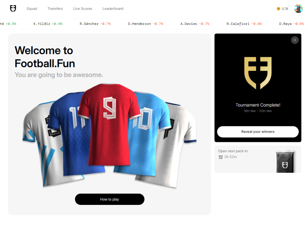 Football.Fun is like fantasy football and token trading had a baby. You rip packs to collect shares in the best players from Europe’s top leagues, trade in and out of them for Gold, and win more Gold via their performances on the pitch.
