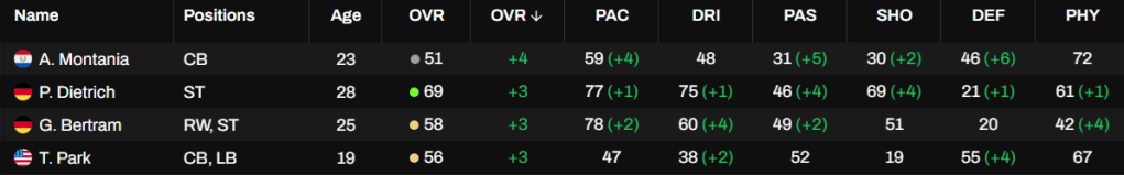 To make this a little more real – I’ve got 76 players in my agency and these are my ones with the highest progression so far this season (and about 50% of my players haven’t seen an increase in their overall rating at all):