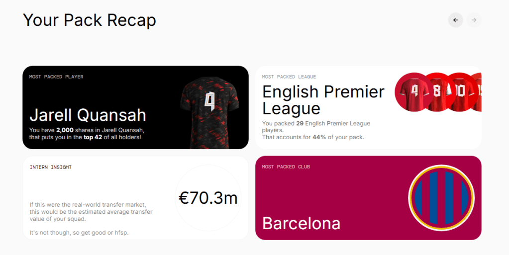 I picked up 28 packs in the Phase 1 Founders Packs sale, which turned into a spread of 66 players. My biggest holdings are in Pedri and Quansah (2000 shares), and I’m more than happy with the overall mix – especially landing some shares in some of the headline acts like Mbappé, Yamal, and Jude Bellingham, and potential tournament monsters like Koundé, Maignan and Valverde.